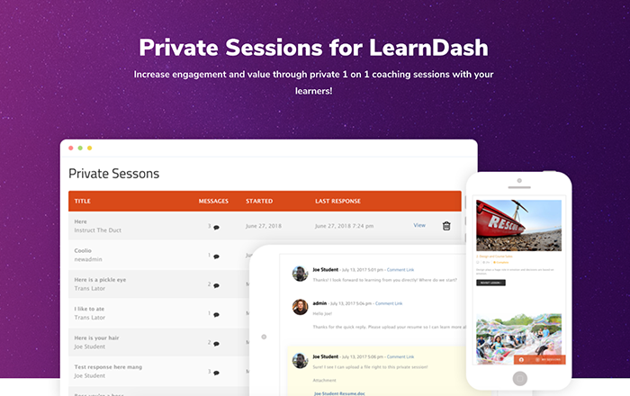 Private Sessions for LearnDash is another great plugin that allows you to have private sessions and offer 1 on 1 teaching or coaching for your students or clients. It allows you to work directly with the student, chat with them, upload and share files. If you want to increase the value of your course, I suggest you check out this plugin.