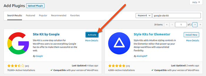 - Search the «Google Site Kit» from the plugin directory and click the «Install Now» button.