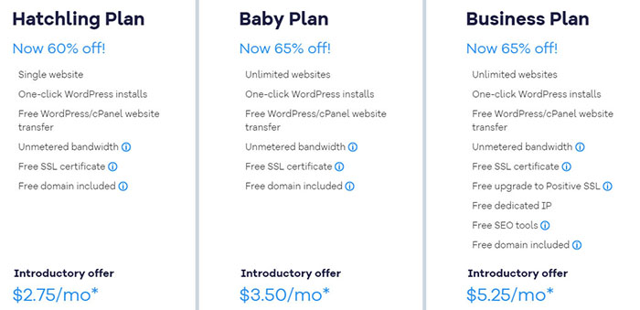 Starting at just $2.75 per month with the Hatchling plan, HostGator’s web hosting is super-affordable. The Baby plan is priced at $3.50 per month and the Business plan that offers many additional features is priced at just $5.25 per month.