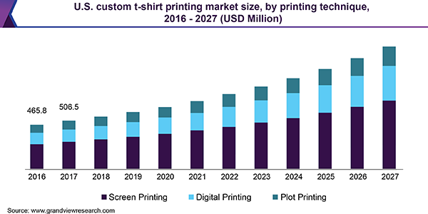 As per their report, the custom t-shirt printing market size was valued at USD 3.4 billion in 2019 and is expected to register a CAGR of 9.6% over the forecast period.