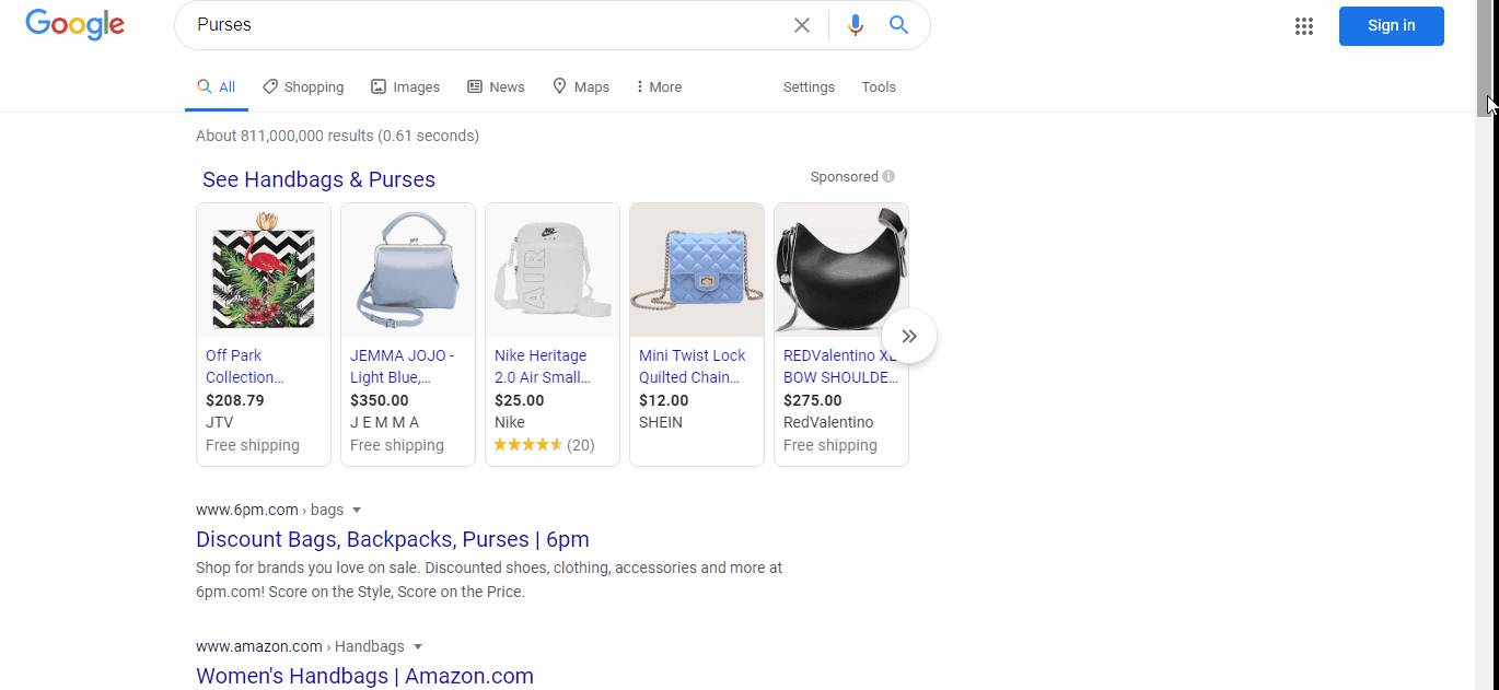 When people search for the term “Purses,” Google leads them directly to the site—where they can make a purchase.