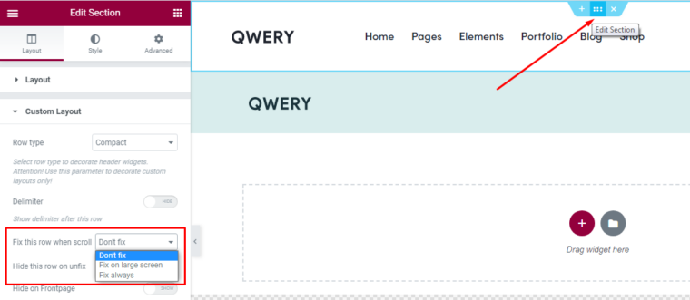 3. You need to switch to “Custom Layout” and select Fix/Don’t fix for “Fix this row when scroll” option (depending on what you need). Fixed section will be visible when scrolling the page.