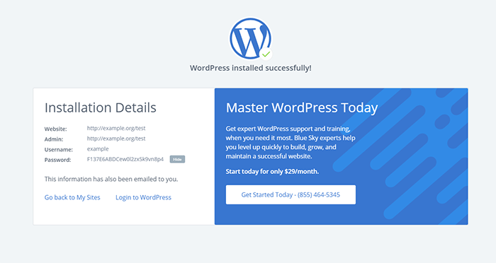 That is it. Your new WordPress site has been successfully installed on BlueHost hosting.