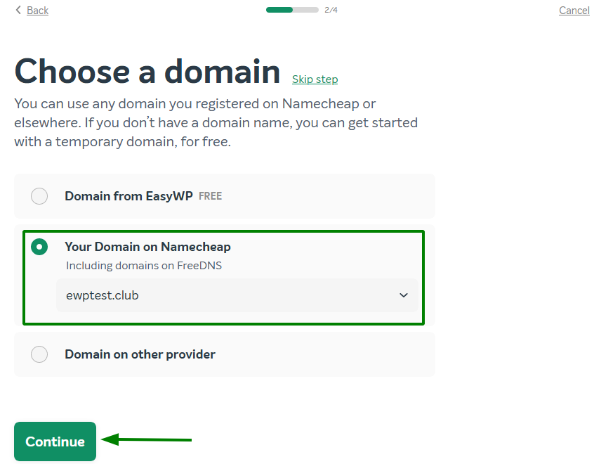 You can then choose to continue to your new website using a free domain from EasyWP. If you want to use one of your registered Namecheap domains, enter the URL or select it from the list. If you prefer to use an external domain, point it to Namecheap’s FreeDNS, and it will appear in the Your Domain on Namecheap drop-down menu.