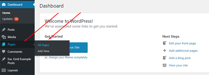 If you need to create a new page, navigate in your dashboard: Pages – Add New.
