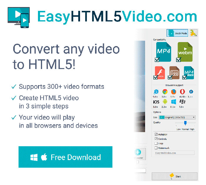 HTML5 is the fastest growing web development trend and HTML5 video as a part of HTML5 becomes the new natural way to show video online. IPad, iPhone, Android, all new browsers declare the support for HTML5 video. It’s great, but what is the usual route to create HTML5 video? First you need to find converters and make three versions of your video – .OGG, MP4, WebM. Then, to provide the compatibility with IE and old browsers you add a fallback Flash version of your video with Flash video player. And finally, you extract an image for poster and write batch lines of code to combine all of it… Quite complicated?