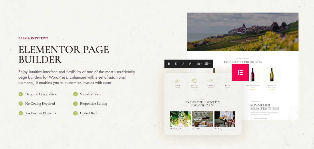 The WineShop theme includes fully customizable demos and inner pages only.Thanks to Elementor Page Builder support, you can integrate the theme with your website with custom content and make it stand out. Apart from that, the theme is packed with a variety of widgets that allow your visitors to explore content smoothly and effectively.