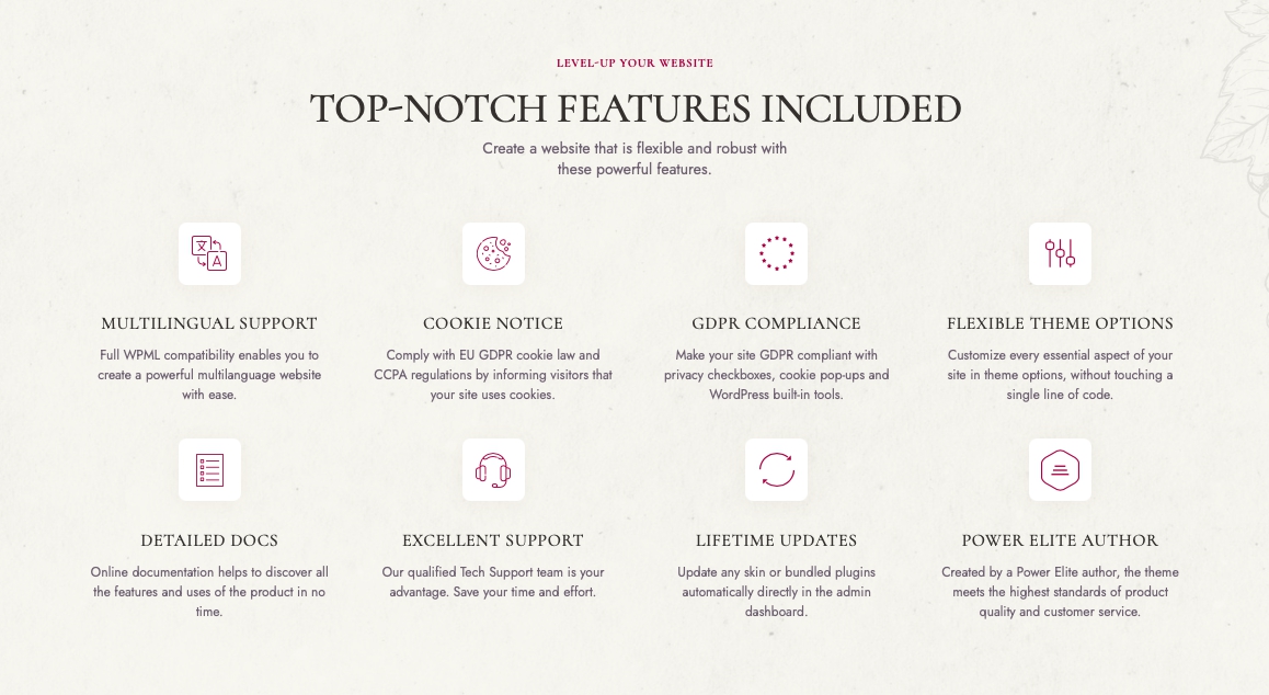 The WineShop theme includes a bunch of advantageous features for both, the entrepreneur and the audience. The theme comes ready for translation, which allows a website owner to translate content into a variety of languages, target foreign audiences, and boost sales. Apart from that, there is a powerful theme framework that includes custom widget sets, custom shortcodes, hundreds of customizer options, and lots of other useful bits and bobs.
